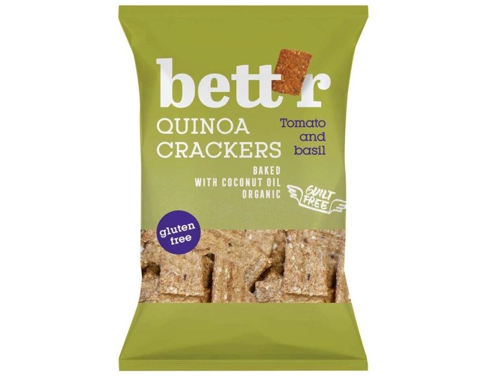 Bett'r Quinoa krekry s paradajkou a bazalkou sú vyrobené z kvalitných surovín v BIO kvalite. Základ tvoria bezlepková ovsená múka a výživná quinoa, ktoré sú doplnené o voňavú bazalku, paradajkový prášok a štipku údenej papriky pre nezameniteľnú chuť. Tieto krekry sú ideálnou voľbou pre zdravé maškrtenie počas dňa, k vínu alebo ako príloha k obľúbenému humusu či nátierkam.